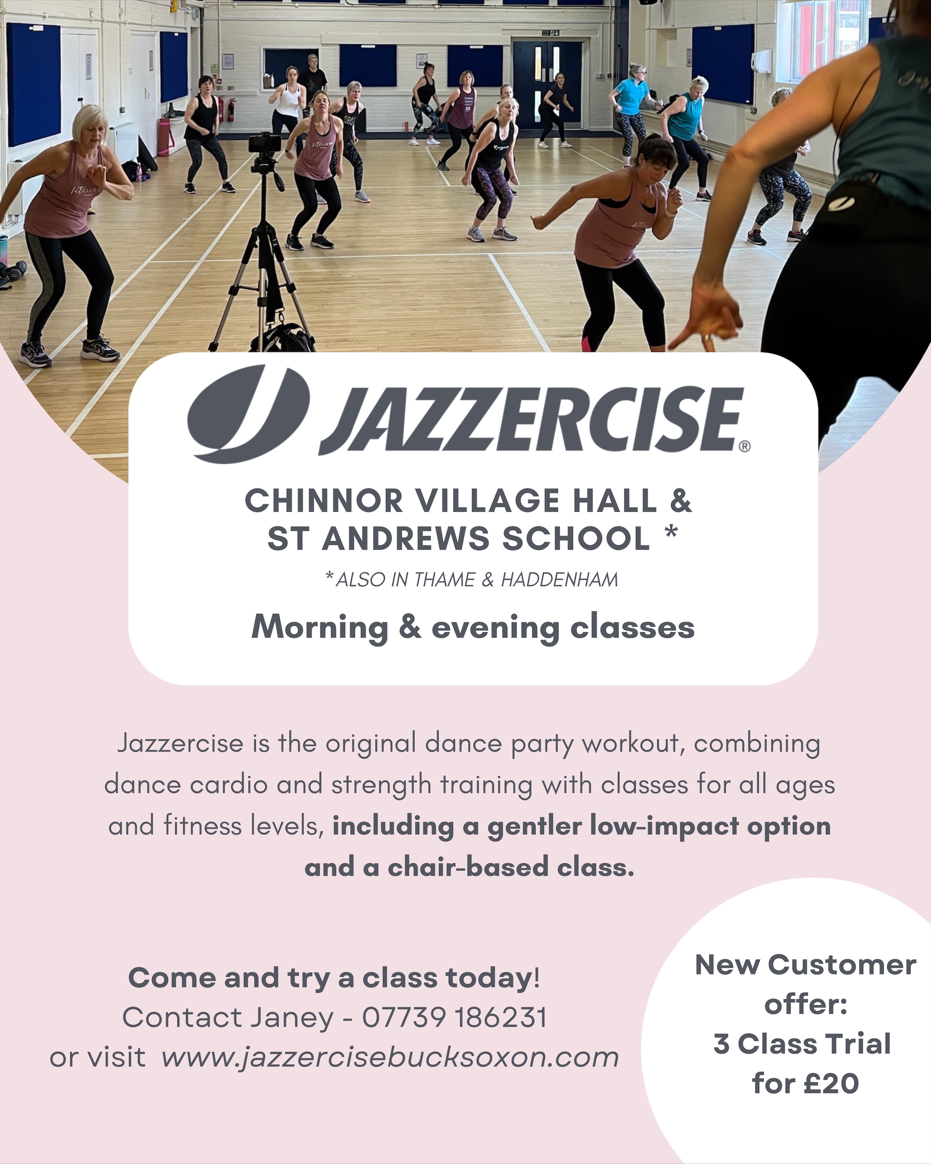Jazzercise Bucks & Oxon runs dance based group fitness classes in Chinnor and surrounding towns and villages. We welcome all ages and abilities to our fun, effective workouts, which are set to current chart music. Modifications and progressions are shown through every class and we'd love to welcome you! There are always special offers and trial passes for new clients, just get in touch.