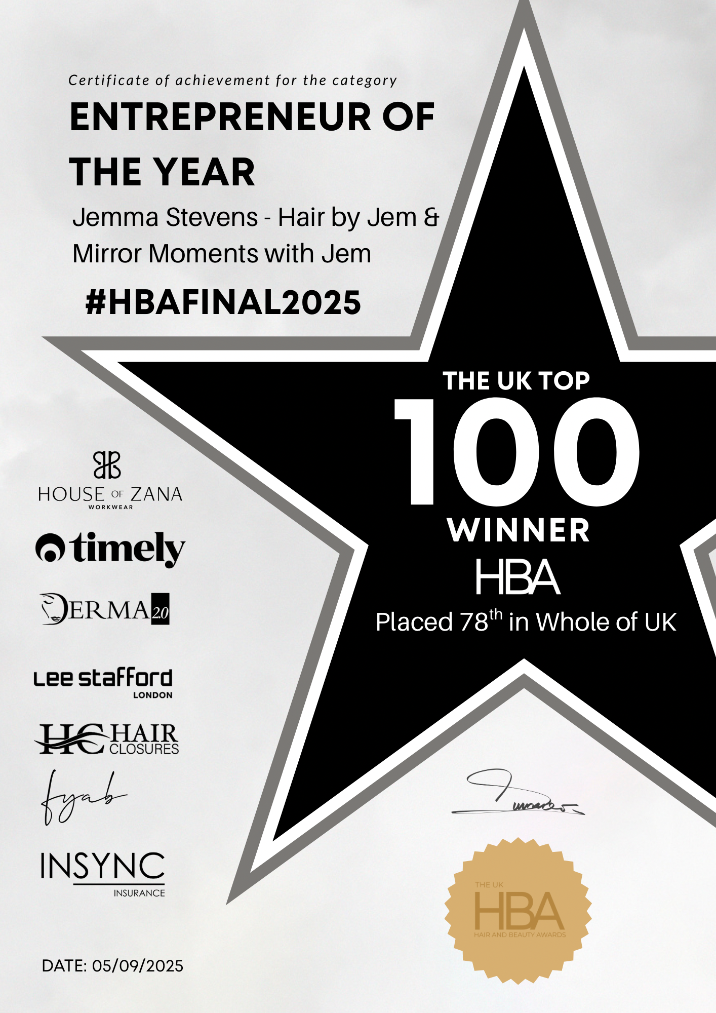 - National Placements – 24th for Mobile Hairstylist of the Year and 78th for Entrepreneur of the Year (UK Hair & Beauty Awards)